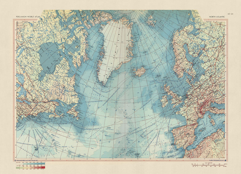 Die „Nordatlantik“-Karte, ein Meisterwerk, das ursprünglich 1967 vom angesehenen topografischen Dienst der polnischen Armee veröffentlicht wurde, ist ein Beweis für die sorgfältige Handwerkskunst dieser Zeit. Es handelt sich um eine detaillierte politische und physische Karte, eine eigenständige Weltkarte, die einen umfassenden Überblick über die Nordatlantikregion bietet. Der geografische Geltungsbereich der Karte erstreckt sich über Nordostkanada, Grönland, Skandinavien, das Vereinigte Königreich, Frankreich, Deutschland, Spanien und Portugal und bietet so eine weitreichende Perspektive dieser verschiedenen Regionen.
