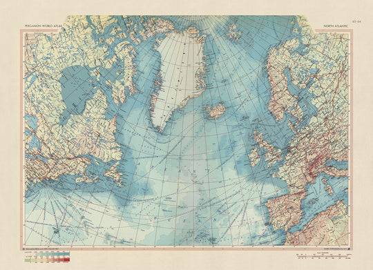 Alte Weltkarte des Nordatlantiks, 1967: Maritime Handelsrouten, Kanada, Grönland, Island, Europa