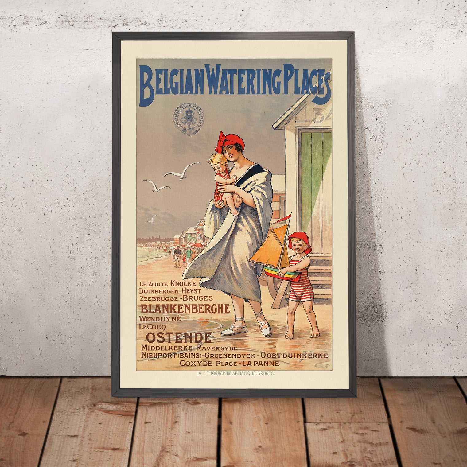 Belgian Watering Places is a charming early‑20th‑century travel poster created for the Belgian State Railway and Mail Packets, with the artist’s name now lost to history. Made to lure British and European holiday‑makers to the North Sea coast, it celebrates Belgium’s string of seaside resorts—what the period cheerfully called “watering places.” At the top, a royal blue headline crowns a sun‑warmed beach scene: a stylish mother in a plush white wrap carries a toddler while a grinning child in a red‑striped swimsuit steadies a toy sailboat, gulls wheel across a soft grey sky, and striped cabins march along the shore. A printer’s credit—La Lithographie Artistique, Bruges—anchors the lower margin.