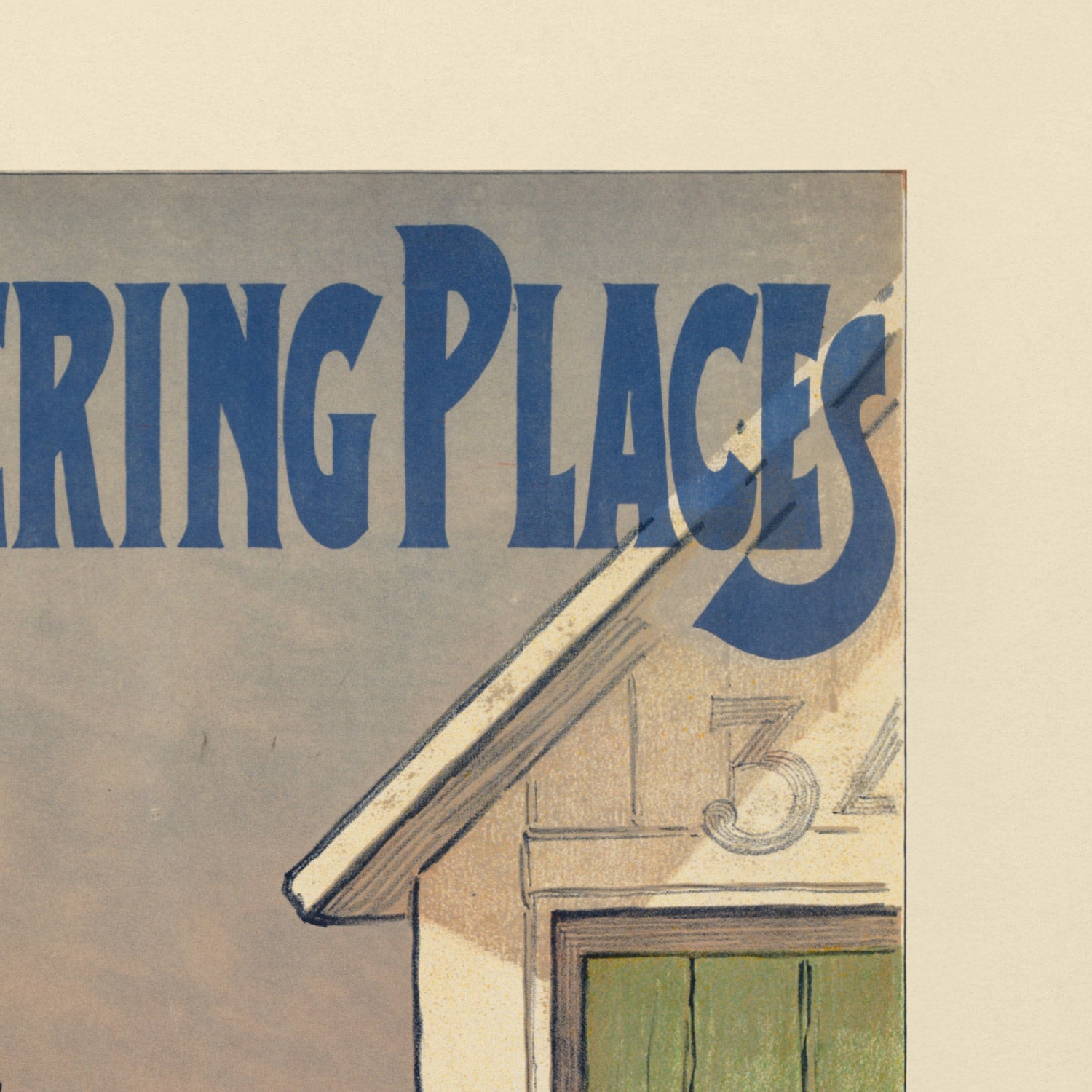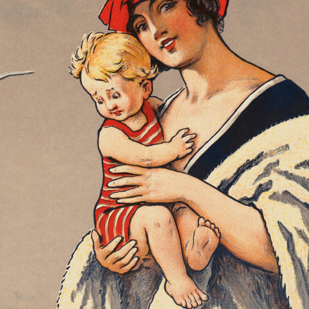 Stylistically, the poster straddles late Art Nouveau and early Deco: strong, simplified forms; generous areas of warm beige and orange sand; and accents of red in the hats and bathing suit that pop against the cool blue title and the green door of beach hut No. 34. The lithographic grain lends a breezy softness to water and sky, while the list of towns provides a typographic rhythm that balances the large central figure. It’s an evocative print for coastal interiors, sunrooms, hallways, or anywhere you want a touch of seaside nostalgia.