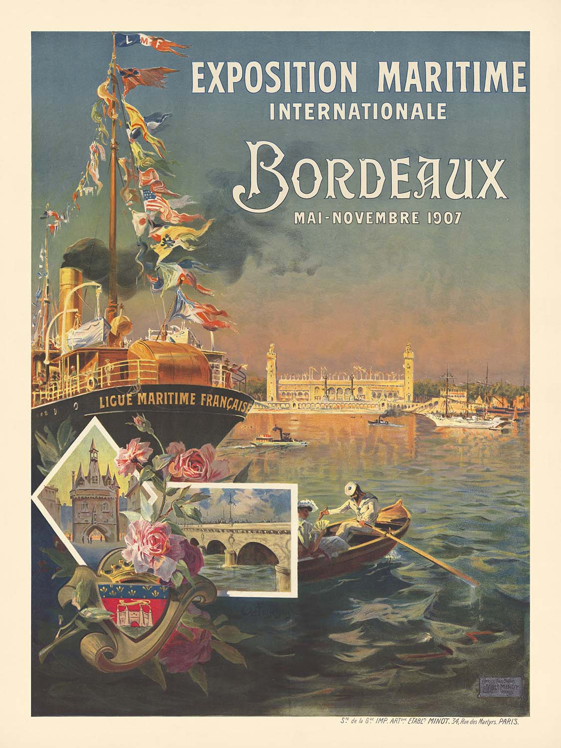 Exposition maritime internationale. Bordeaux, mai–novembre 1907 by Établissements Minot captures the spirit of a grand maritime celebration at the height of the Art Nouveau era. Created in 1907 to promote Bordeaux’s International Maritime Exposition, this antique travel poster evokes the bustle of a great Atlantic port on the Garonne River—where shipping, trade, and modern engineering met the elegance of Belle Époque design. Flowing lines, botanical ornament, and a luminous palette come together to advertise months of festivities in a city renowned for wine, riverfront architecture, and seafaring heritage.