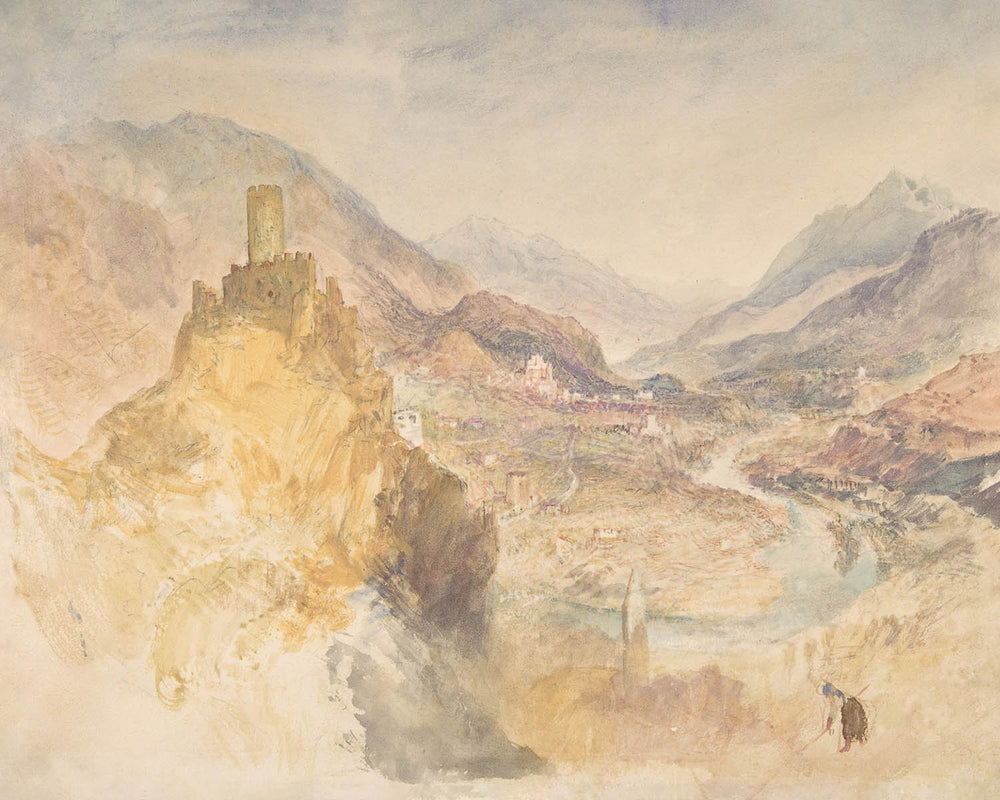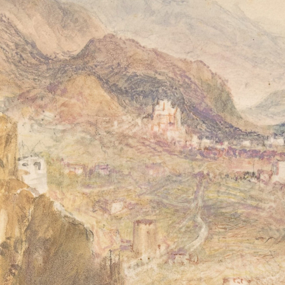 Chatel Argent and the Val d’Aosta from above Villeneuve (1836) by Turner captures the Romantic spirit at its most luminous and contemplative. Painted during Turner’s Alpine travels, this view looks across Italy’s Aosta Valley toward weathered fortifications and sweeping mountain ranges, where architecture bows to the grandeur of nature. Turner, often called the “painter of light,” uses watercolor’s delicacy to bathe the scene in an atmospheric glow, bringing together emotion, memory, and the sublime vastness of the landscape.