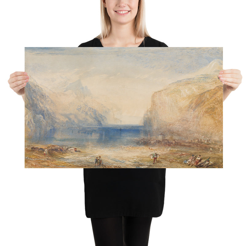 The subject here—Flüelen, at the southern reach of Lake Lucerne in the Swiss canton of Uri—held special resonance for Turner during his Alpine journeys. At a time when travelers and artists alike were enthralled by the drama of the Alps, he sought not a cartographer’s precision but the felt truth of place: the first warmth of sun on cool water, the vertiginous lift of slopes, the stillness broken by a few figures at the edge of an immense scene. This is Romanticism’s hallmark—the smallness of humankind before nature’s immensity—delivered with tenderness rather than terror.