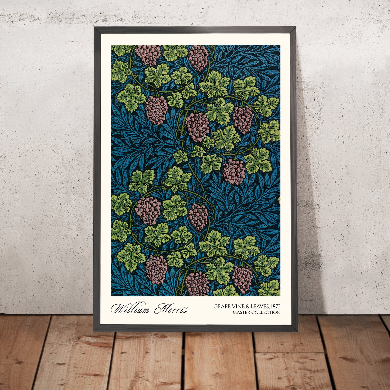 For a curated, gallery-wall look, you may opt to include the artist’s name and the pattern title—“William Morris • Grape Vine & Leaves”—either above or below the artwork. This tasteful typographic detail can help anchor a collection or add a scholarly touch to a single statement piece.