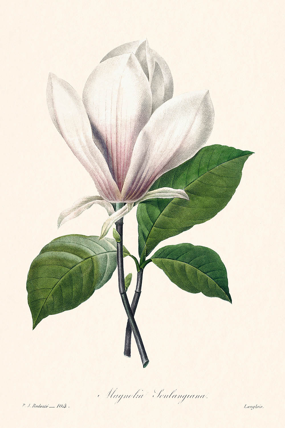 Einführung von "Magnolia Soulangiana" (Schalen-Magnolie) durch den illustren Pierre-Joseph Redouté, eine geschätzte botanische Illustration, die erstmals 1827 veröffentlicht wurde. Bekannt als ein viktorianisches botanisches Meisterwerk, fängt dieses Kunstwerk die exquisite Schönheit der Magnolia Soulangiana mit unvergleichlicher Präzision und Eleganz ein.