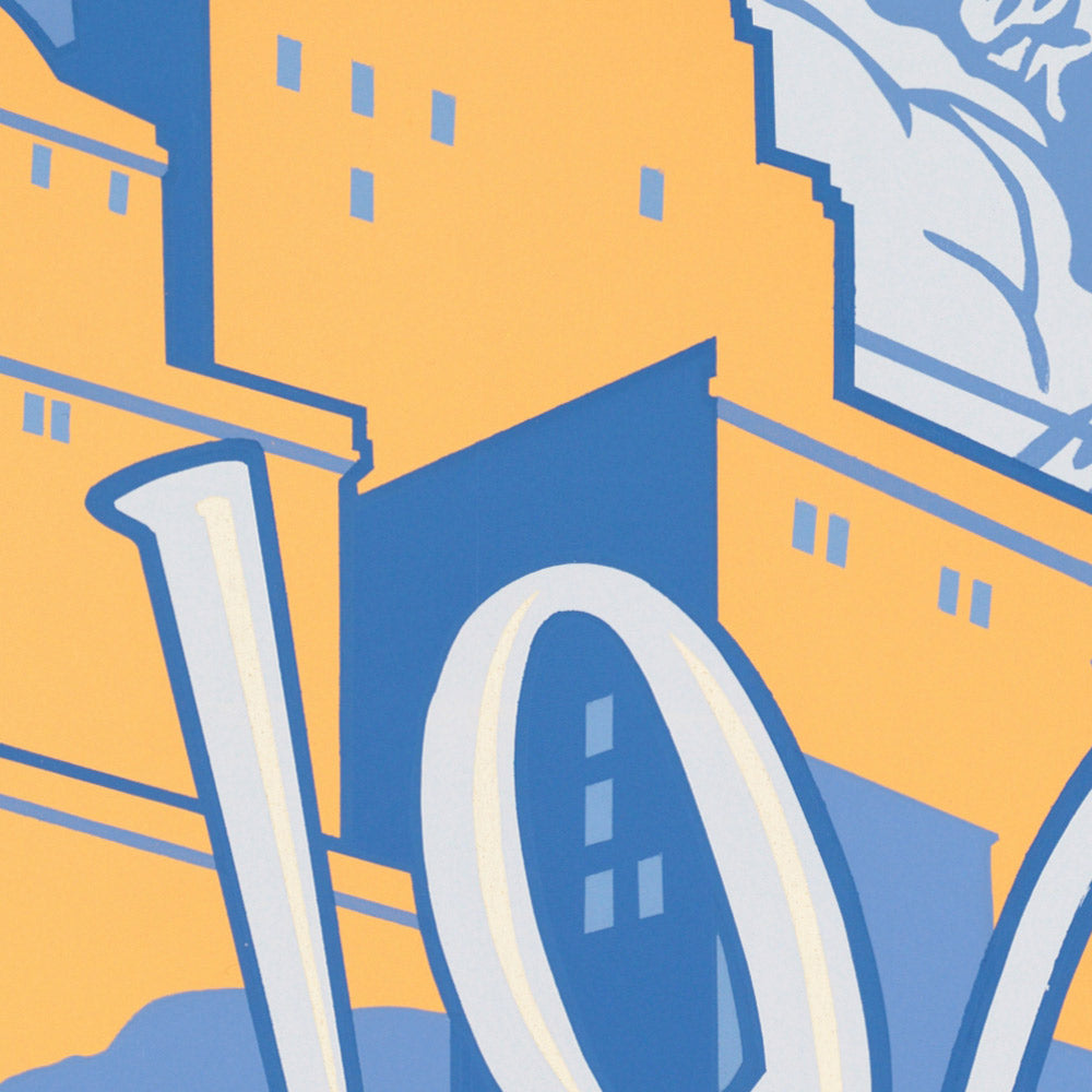Stylistically, the poster uses streamlined geometry—planes of color, simplified silhouettes, and disciplined type—to balance elegance with impact. The dominant blue suggests open skies and coastal horizons, while golden yellows and soft oranges warm the scene like first light over the Pacific. Deep black outlines and accents heighten contrast and readability, making the composition pop across a room. Displayed in an entryway, living space, or study, it brings an authentic dose of Art Deco poise and travel-era romance to contemporary interiors.