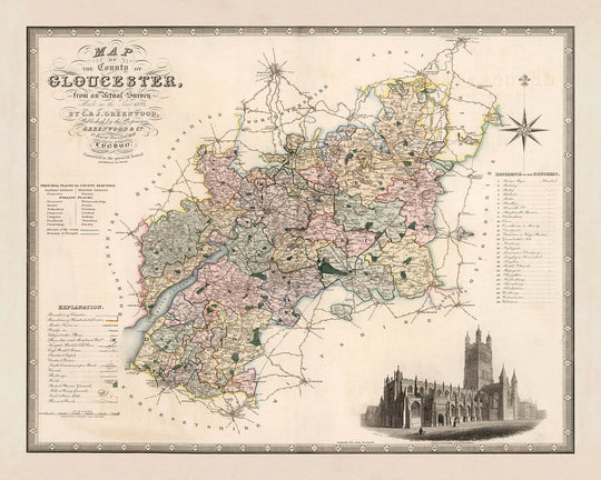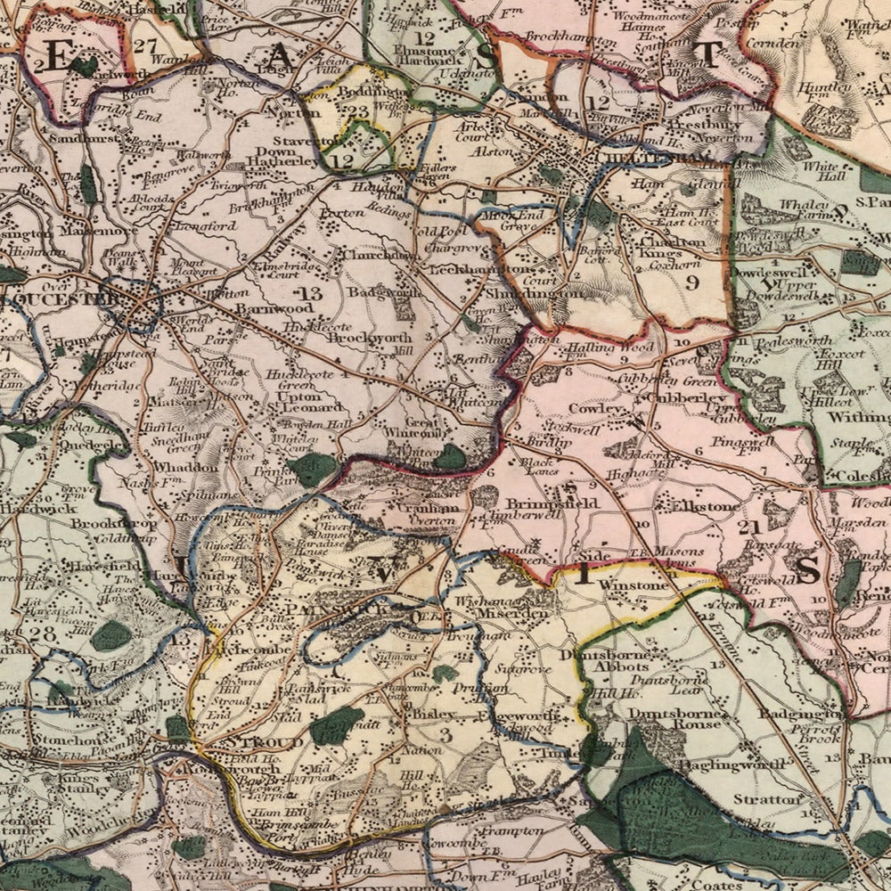 Greenwood clarifies the county’s political complexion through discriminating washes that distinguish its administrative divisions while maintaining legibility across towns and rural districts. The River Severn dominates, sweeping past Tewkesbury at its confluence with the Avon and broadening toward Gloucester, the civic heart vividly inscribed amid radiating roads. Cheltenham, then an ascendant spa, stands prominently to the northeast; Cirencester, heir to Roman Corinium, anchors the Cotswold edge; and Stroud is nestled amid valleys that descend toward the Severn. A dense lattice of turnpike roads and local byways binds these places, articulated with a clarity that suggests coach travel and commercial exchange. The map’s careful hierarchy of lettering and line weights ensures that political borders never overwhelm the practical information so vital to nineteenth‑century movement and trade.