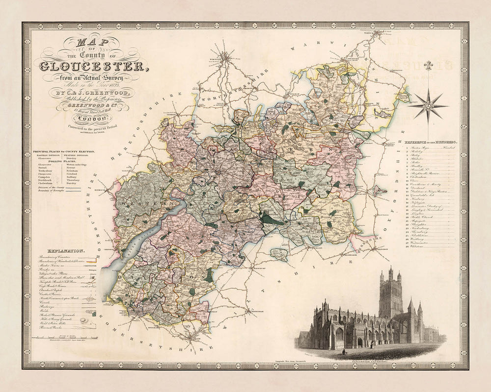 Map of the County of Gloucester, engraved by Christopher Greenwood in 1831 and issued by J. S. Virtue, presents Gloucestershire with a consummate blend of precision and poise. Executed as a finely engraved, hand-colored production, it aligns with Greenwood’s characteristic early nineteenth-century aesthetic: an elegant title cartouche, ornamental border work, and a poised compass rose turning north to the upper right. Relief is rendered by lucid hachures that catch the eye like light on folded cloth, animating the county’s slopes and vales. An engraved prospect of Gloucester Cathedral enriches the composition, anchoring the geography in stone and story. The whole coheres as both document and artwork, a county-scale portrait whose exacting line, restrained palette, and crisp lettering speak to the era’s highest cartographic standards.