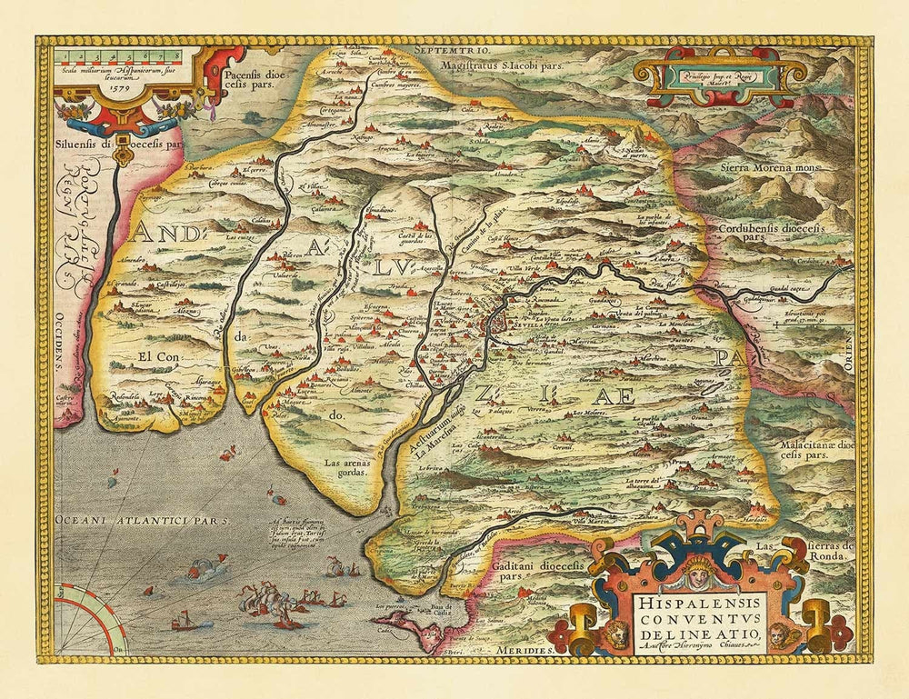 Eine erfreulich charaktervolle und äußerst seltene Abraham Ortelius-Karte von Südwestspanien, Andalusien, mit Fokus auf die Stadt Sevilla. Die Karte wurde ursprünglich 1573 als Teil des Theatrum Orbis Terrarum veröffentlicht, dem ersten modernen Atlas der Welt.