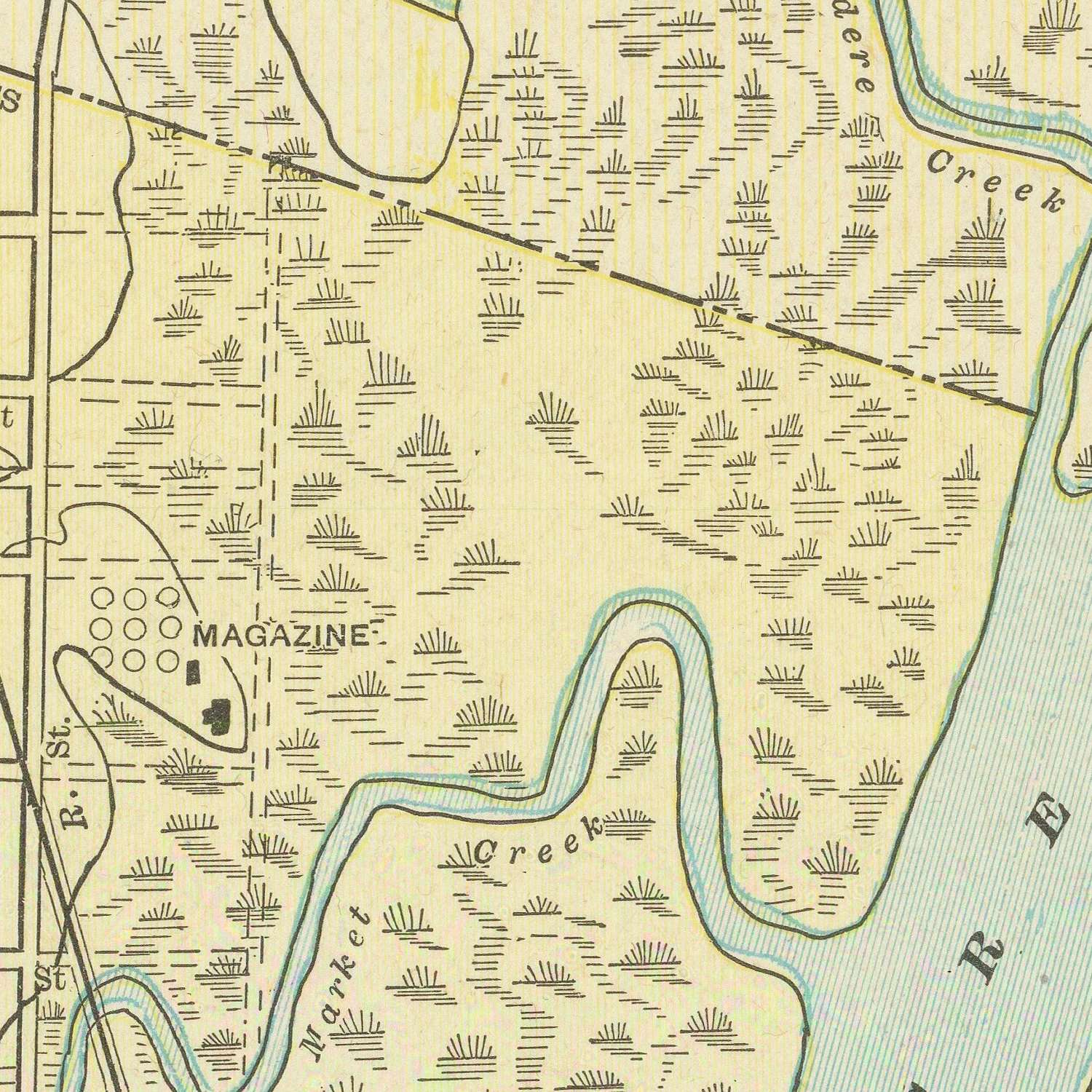 At the peninsula’s upper reaches, the map traces Charleston’s evolving landscape of leisure and memory. Hampton Park is shown in the context of the Washington Race Course—at the time a racecourse named in honor of George Washington—capturing the transition from track to city parkland that would soon define the area. The adjacent Public Cemetery and Magnolia Cemetery extend a contemplative green corridor toward the Cooper River, their curving lanes and ordered plots contrasting with the rectilinear city grid. Together these spaces reveal how Charlestonians balanced recreation, commemoration, and the preservation of open ground as the city grew northward, making this an especially revealing urban portrait.
