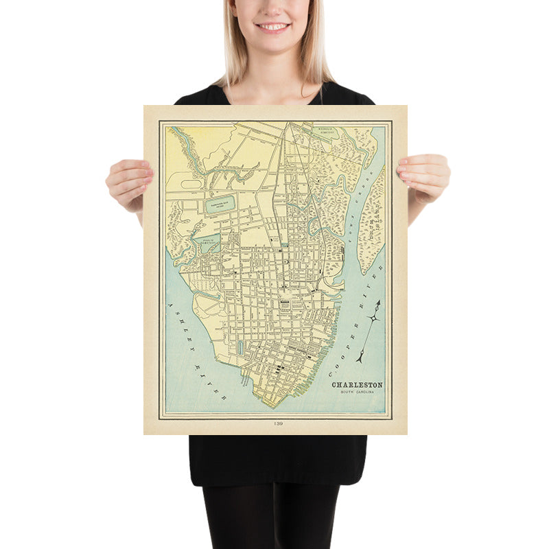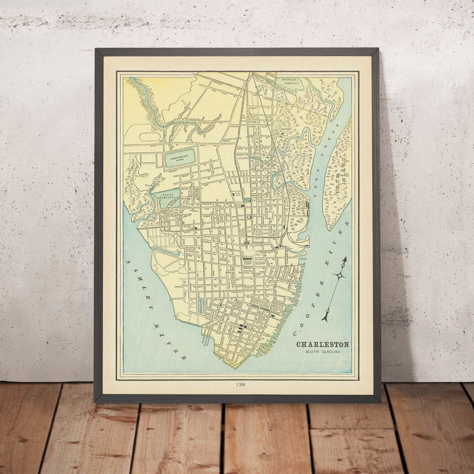 Charleston South Carolina, issued in 1900 by the eminent American mapmaker George F. Cram, presents a richly detailed city plan of the peninsula between the Ashley and Cooper Rivers at a moment of poised transition. Executed in cerographic printing, its vibrant color blocks and crisp linework distinguish districts, thoroughfares, and the city’s working waterfront with remarkable clarity. Ornate cartouches and careful late-19th-century embellishments frame a composition that is both useful and elegant, inviting close study of streets, public places, and civic institutions. As a city map, it is especially compelling for how it captures the historic core—church spires, market streets, and river edges—just as Charleston enters the modern twentieth century but before large-scale redevelopment recast its neighborhoods.