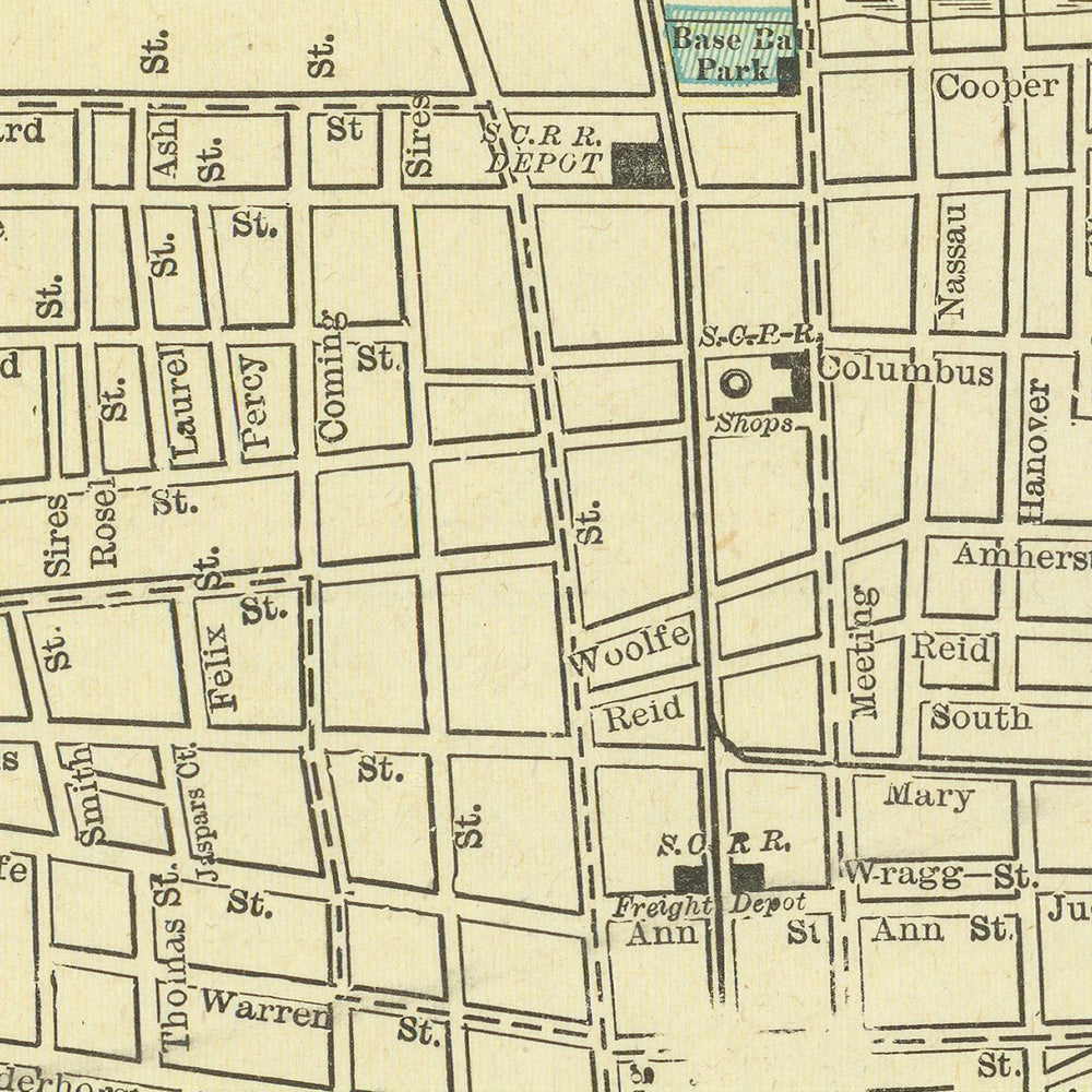 Cram’s plan organizes the peninsula’s famed street grid with a legibility that rewards exploration. King Street and Meeting Street run like spines through an intricate weave of cross streets—Beaufain, Wentworth, George, Tradd, and Society—while Church and East Bay converge toward the storied tip of the Battery. To the northwest, Cannonborough coheres around Cannon Street and Ashley Avenue, an area of growing residences knit to commerce along King. Nearby Radcliffeborough is annotated with a small military academy, and the Citadel campus appears as expanses of largely open ground—an eloquent cartographic pause that hints at future growth. This interplay of dense blocks and institutional greens conveys the period’s urban planning ethos with uncommon precision.