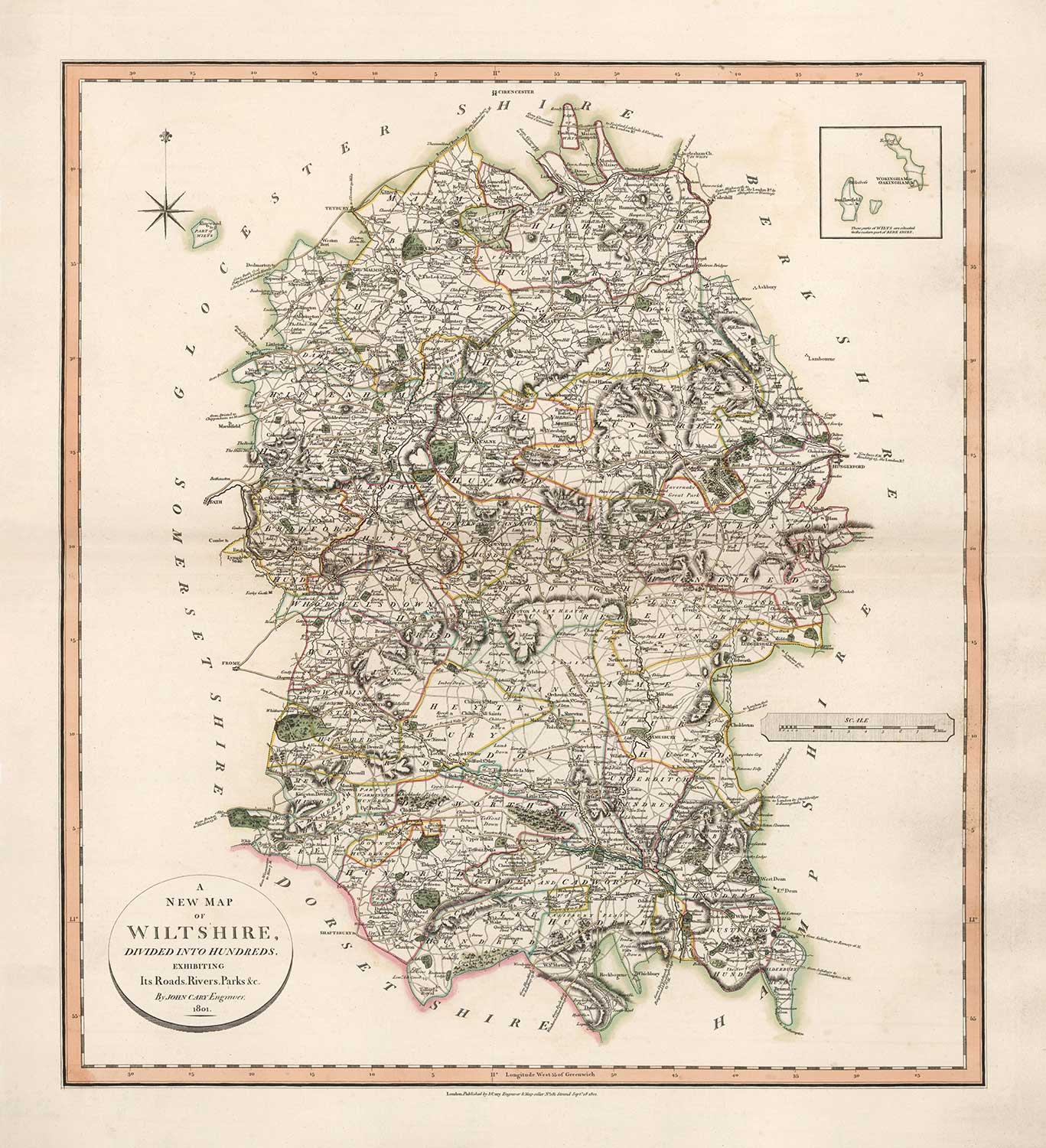 Diese wunderbare alte Karte von Wiltshire wurde ursprünglich 1801 veröffentlicht. Sie wurde von John Cary erstellt.