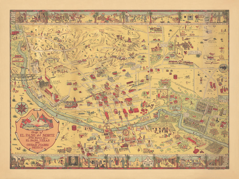 Schreiten Sie zurück in die Zeit mit dieser exquisiten bildlichen Karte von El Paso del Norte aus dem Jahr 1932, auch bekannt als El Paso, Texas, und Ciudad Juarez, Mexiko, erstellt von dem renommierten Kartenmacher C.R. Dockum. Diese historisch informative Vogelperspektivkarte ist eine visuelle Reise durch die reiche und vielfältige Geschichte dieser einzigartigen Grenzregion. Die Karte ist mit detaillierten Illustrationen geschmückt, die bedeutende Ereignisse festhalten, wie die Gründung der Guadalupe-Mission im Jahr 1659 und den Beitritt von El Paso zur Union im Jahr 1845, und bietet einen faszinierenden Einblick in die Vergangenheit.