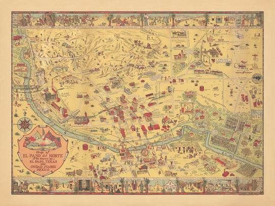 Das komplexe Design der Karte hebt wichtige historische und kulturelle Wahrzeichen hervor, die die Region geprägt haben. Vom historischen Camino Real, einer wichtigen Handelsroute, bis zu den majestätischen Franklin Mountains ist jedes Element sorgfältig illustriert. Die Karte zeigt auch die ikonische El Paso del Norte Brücke, die die Schwesterstädte über den Rio Grande verbindet und das dauerhafte Band zwischen den Vereinigten Staaten und Mexiko symbolisiert. Jedes Wahrzeichen, von der Ysleta-Mission bis zum geschäftigen Union Depot, erzählt eine Geschichte von Wachstum, Widerstandsfähigkeit und kultureller Verschmelzung.