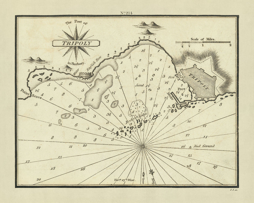 Bemerkenswert ist, dass die Karte mit Süden oben ausgerichtet ist, ein Merkmal, das in der modernen Kartografie nicht häufig zu sehen ist, aber in bestimmten historischen nautischen Karten verbreitet ist, um sich mit dem Ansatz der Seeleute zu den Häfen vom Meer aus zu decken. Sie markiert akribisch bedeutende Landmarken wie das Englische Fort und die Mole, die während dieser Zeit für Navigation und Verteidigung von entscheidender Bedeutung waren. Die Darstellung der Befestigungen rund um Tripoli, einschließlich detaillierter Layouts von Ankerplätzen und Verteidigungsstrukturen, gibt einen Einblick in die geopolitische Bedeutung von Tripoli als befestigtem maritimen Zentrum zu Beginn des 19. Jahrhunderts.