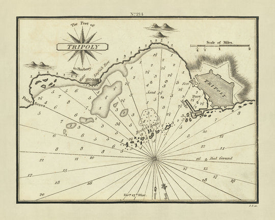 Diese Karte zeichnet sich durch ihre präzise Darstellung der Küsten- und Unterwassertopografie aus, die für die Navigation unerlässlich ist. Sie enthält Tiefenangaben in Faden, die die Wassertiefen detailliert darstellen, was für die sichere Passage von Schiffen durch die gefährlichen Routen rund um Tripoli entscheidend ist. Die Einbeziehung von Navigationshilfen wie einer Kompassrose, Strömungen und Wasserkanälen, zusammen mit Anmerkungen zu den Sandbänken, dem berüchtigten 'Bad Ground' und anderen Gefahren, hebt die Risiken hervor, denen Seefahrer damals ausgesetzt waren, und unterstreicht den Wert der Karte zur Unterstützung ihrer Reisen.