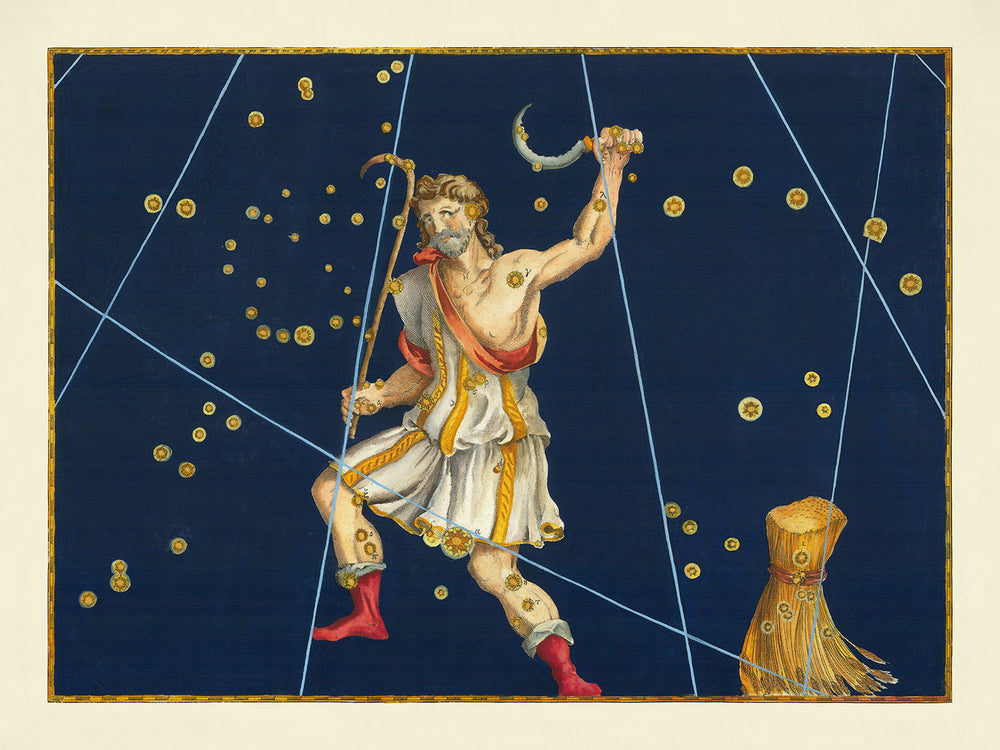 Die Verwendung von Gold zur Hervorhebung der Sterne und die handkolorierten Techniken, die von Bayer angewendet wurden, erheben diesen Druck zu einem echten Kunstwerk. Sein historischer und ästhetischer Wert macht ihn zu einer attraktiven Option für Astronomie-Enthusiasten, Geschichtsinteressierte und Kunstliebhaber gleichermaßen. Die feine Kunstfertigkeit kombiniert mit den tiefgründigen mythologischen Geschichten garantiert, dass dieses Stück jeden fesseln wird, der es betrachtet.