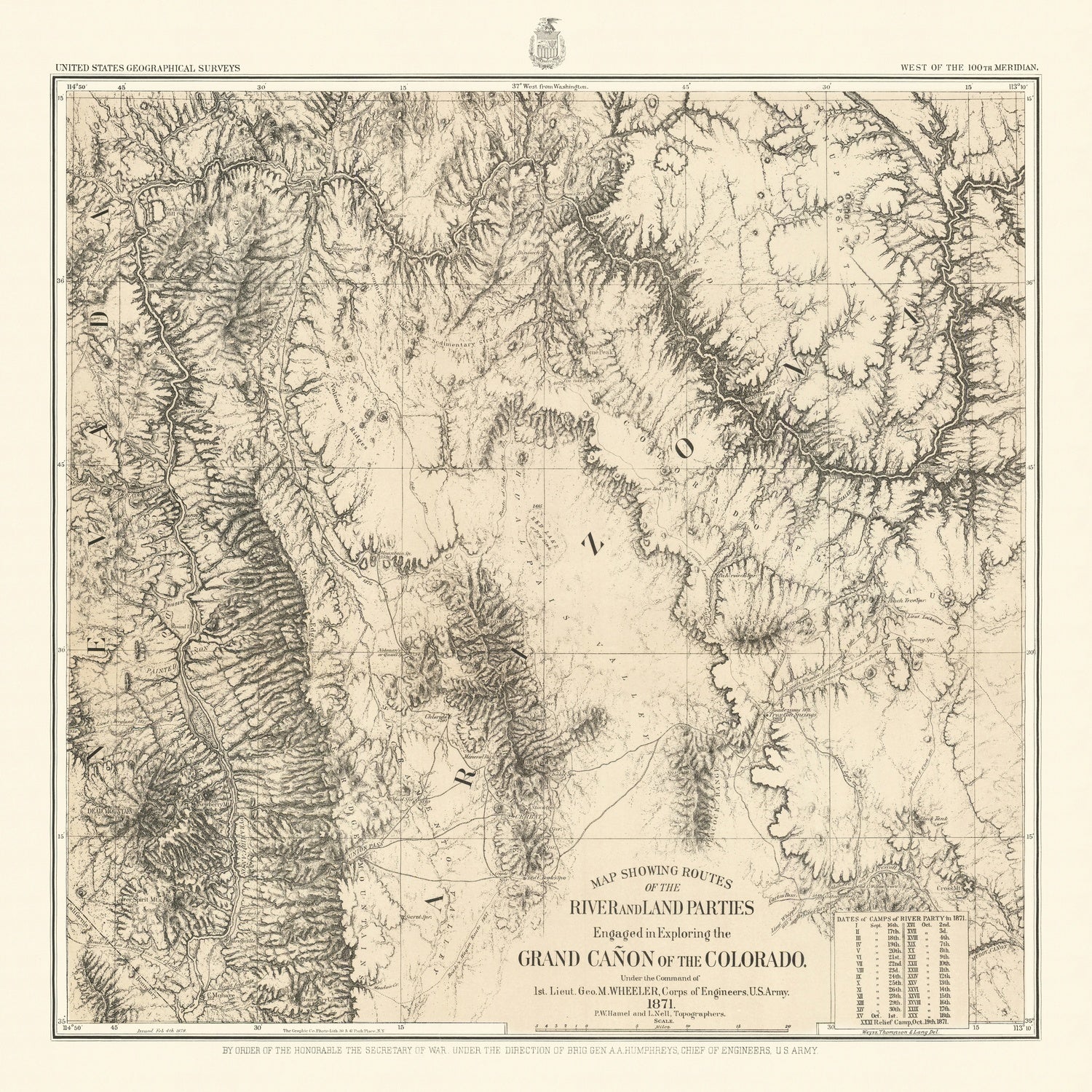 As an instrument of statecraft and science, Wheeler’s mapping helped seed later achievements in topographic cartography, resource surveys, and environmental planning, including the reclamation era and the eventual protection of the Grand Canyon. The disciplined contours, keyed symbols for routes and camps, and careful boundary delineations demonstrate a method that fused field observation with emerging geodetic standards. Yet beyond its technical mastery, the map preserves the narrative of audacious exploration—boats bucking rapids, land parties edging across mesas, scouts reading cloud shadows for hidden water. It is a rare convergence of art and empiricism, illuminating a defining chapter in the making—and imagining—of the American West.