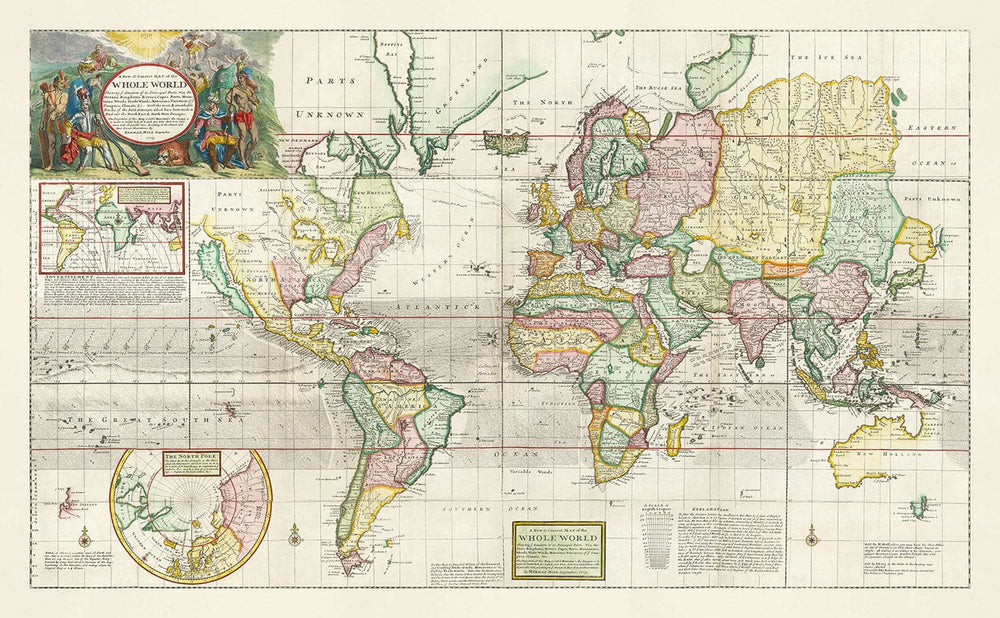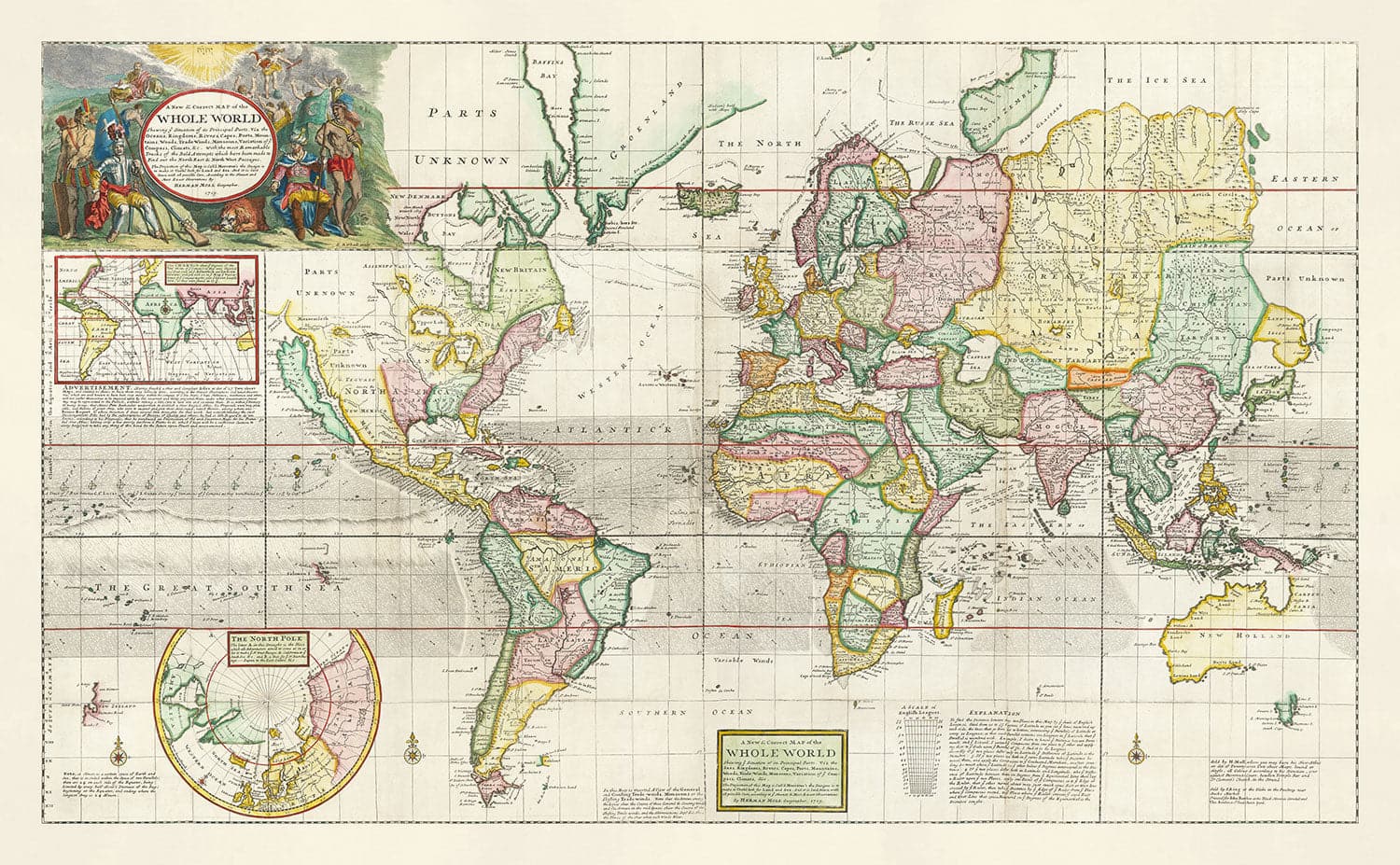 Alte Weltkarte von 1719 von Herman Moll: Großes Kolonial- und Entdeckungsatlas-Diagramm