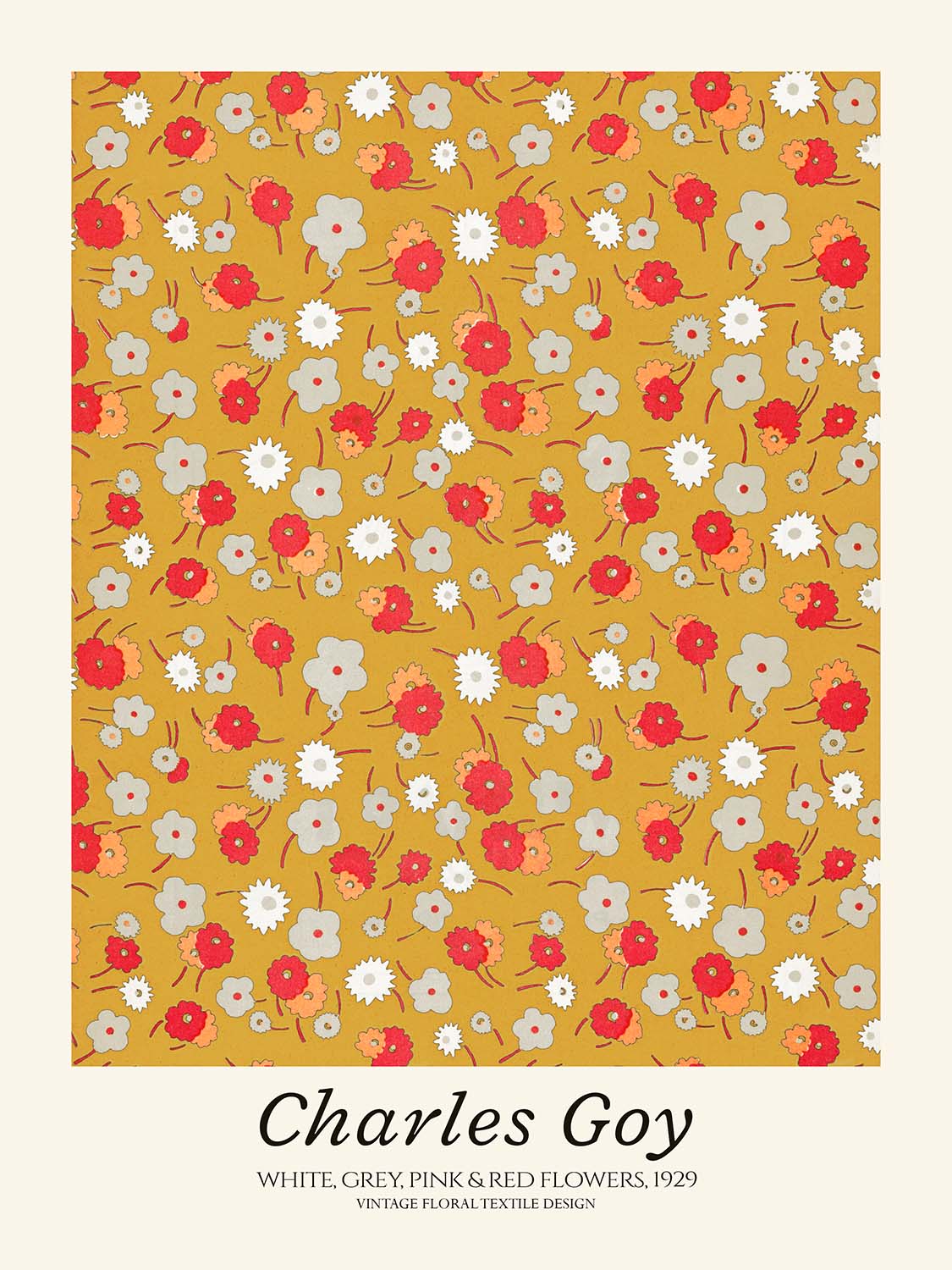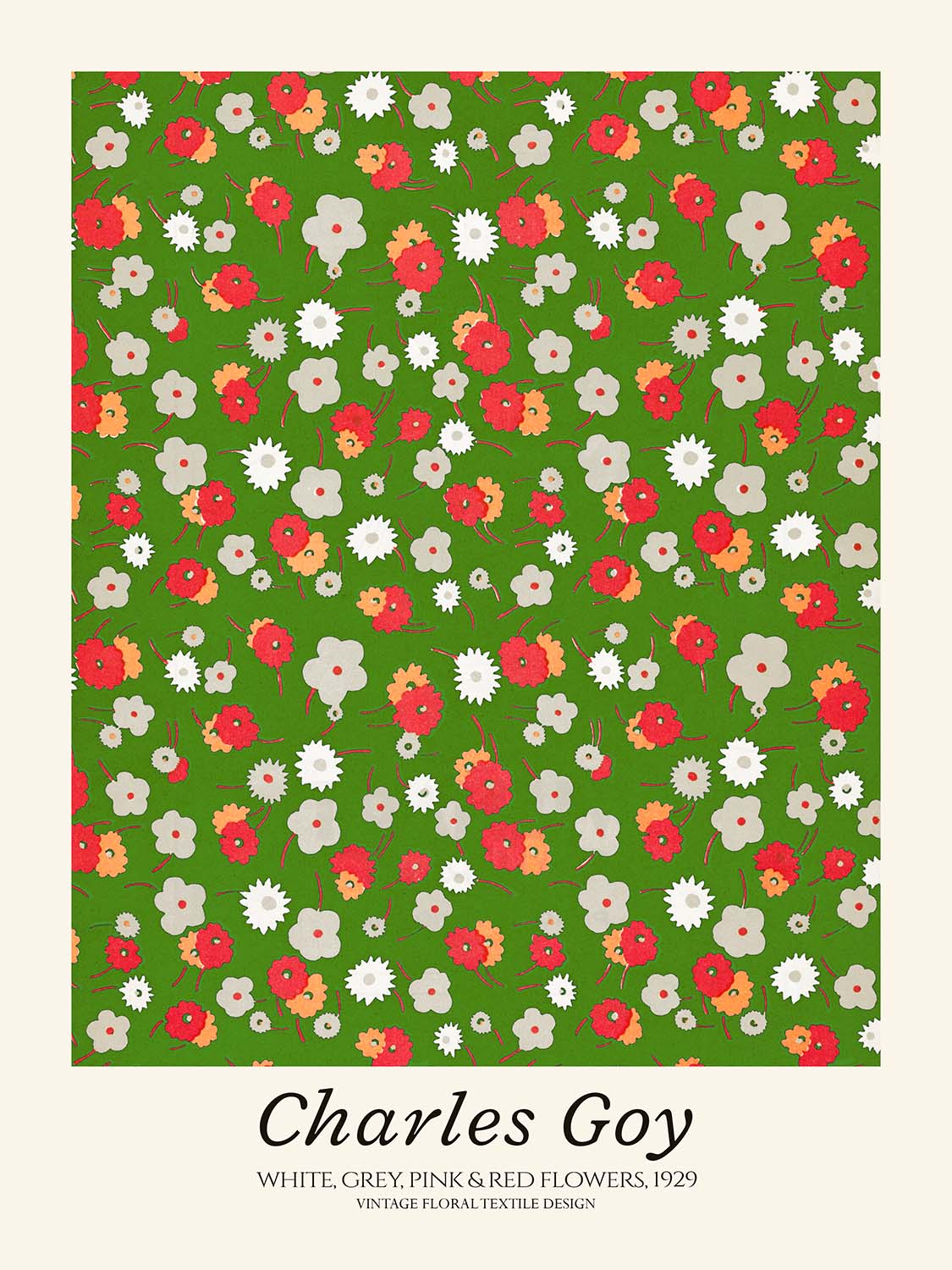 White, Grey, Pink & Red Flowers by Charles Goy (1929) is a lively interwar floral repeat that channels the elegance of Art Deco while anticipating the crisp stylisation of early Modernism. Newly restored from the original pattern, this high-quality print preserves Goy’s bold rhythm of blossoms and rounded forms, capturing the optimism and decorative flair that defined late-1920s design.