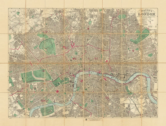 Gran mapa antiguo de Londres por Bacon, 1890: Raro gráfico de pared plegable de la Inglaterra victoriana