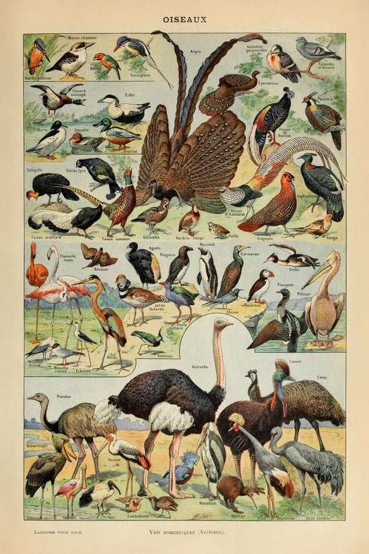 Birds (1) by Adolphe Millot is a captivating Victorian era zoological illustration created in 1890, which exquisitely details a wide array of bird species. This artwork was originally published in the famed French encyclopedia, "Le Larousse pour tous: nouveau dictionnaire encyclopédique". Adolphe Philippe Millot was not only a distinguished French artist – a painter, lithographer, and member of the Salon des Artistes Francaise – but also a renowned entomologist. This remarkable piece stands out for its scientific accuracy and rich artistry, presenting zoologically correct portrayals of numerous bird species, with each specimen distinctly labeled in elegant French script.