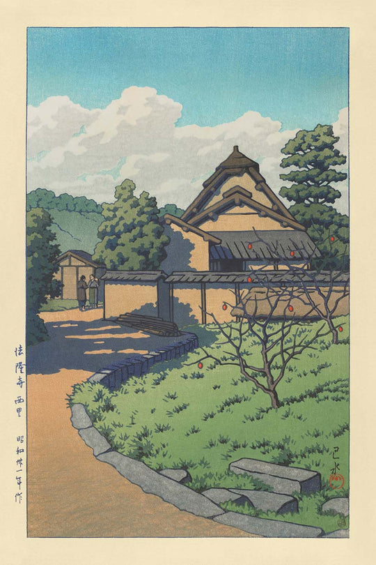 Hasui Kawase es conocido por su trabajo durante principios del siglo XX como parte del movimiento artístico shin-hanga, que revitalizó las impresiones tradicionales ukiyo-e (mundo flotante) para una audiencia contemporánea. El "Horyuji Temple West Village" muestra su habilidad característica para combinar la artesanía japonesa tradicional con sensibilidades modernas. La obra es notable por su representación pacífica de una escena de templo rural, empleando colores suaves y una rica profundidad de detalle que invitan tanto a la reflexión como a la admiración.