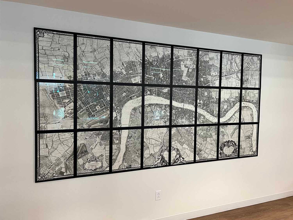 Puedes elegir el mapa como una sola pieza, o como 24 piezas separadas. La pieza única es más fácil de colgar, y estéticamente puede que la prefieras. 24 piezas son más auténticas, ya que cada mapa fue emitido originalmente por separado, y crea un efecto muy impactante cuando se enmarca en la pared como una cuadrícula gigante.