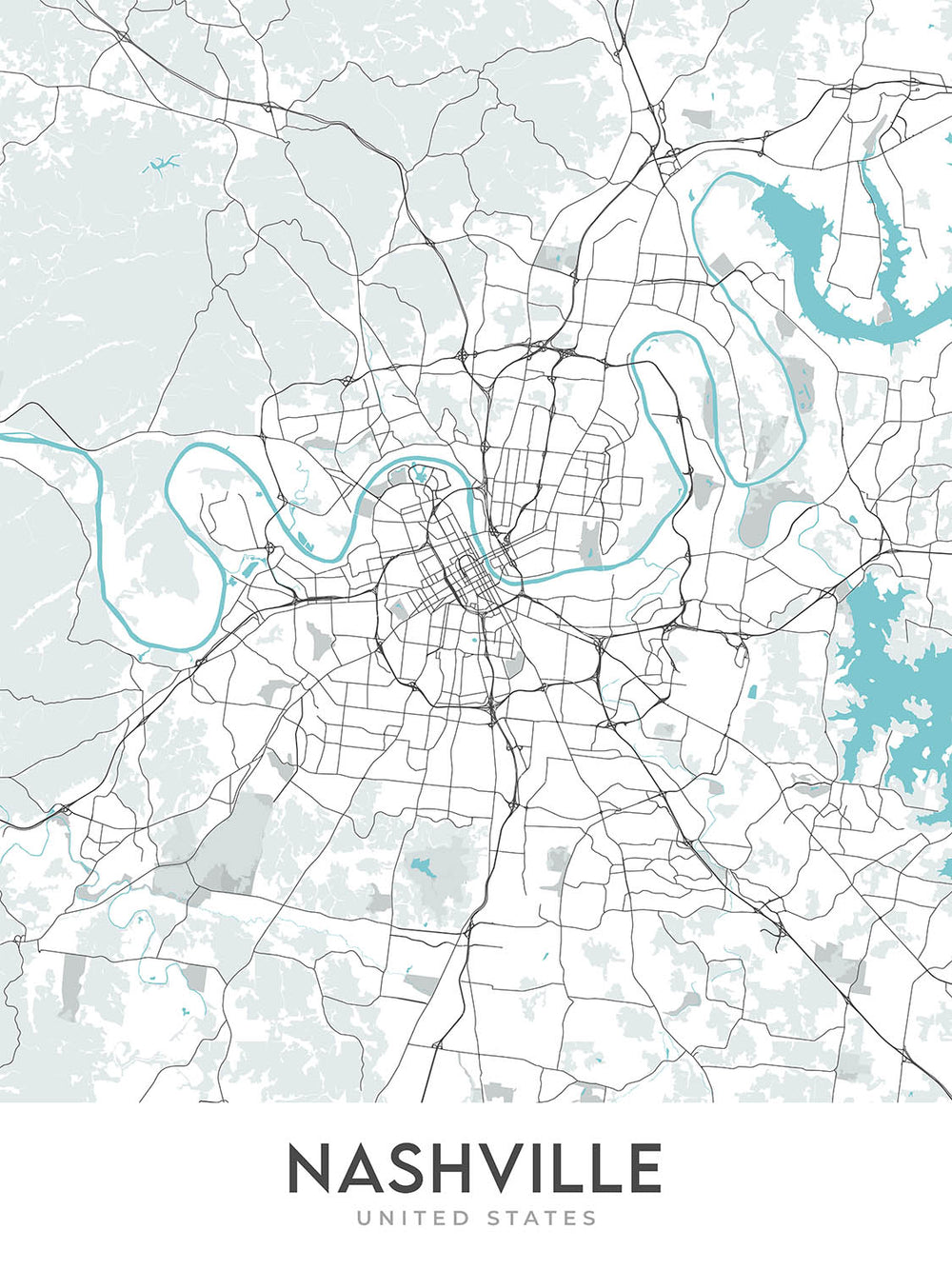 Mapa moderno de la ciudad de Nashville, TN: centro, Music City Center, Vanderbilt, Germantown, Shelby Park