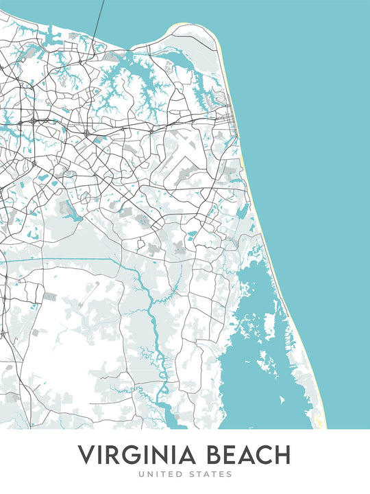 Este mapa de Virginia Beach, creado por The Unique Maps Co. en 2024, es un callejero moderno y detallado que captura la esencia de esta vibrante ciudad costera. El mapa cubre una parte importante de Virginia Beach, incluido el bullicioso centro de la ciudad, los tranquilos barrios residenciales y las hermosas playas que bordean el Océano Atlántico.