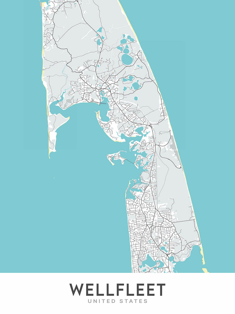 Este mapa es una creación original de The Unique Maps Co., que presenta una cartografía única, un diseño moderno y una paleta de colores única. El mapa está impreso en papel de alta calidad y está disponible en varios tamaños. Este mapa es perfecto para cualquiera que ame Wellfleet o para cualquiera que aprecie los mapas hermosos.