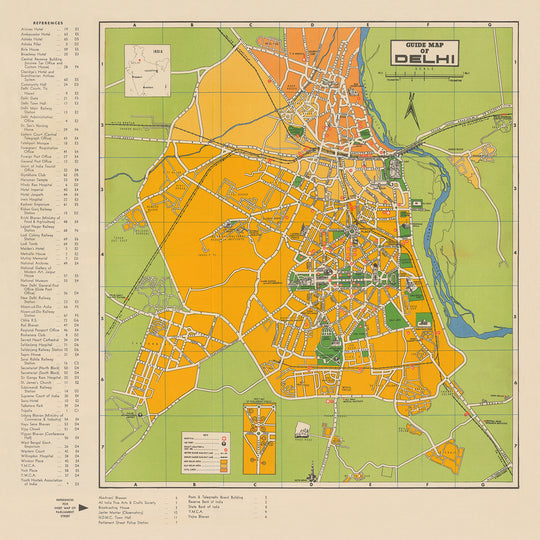 - El mapa proporciona un diseño de las calles de Delhi, edificios significativos y otros puntos de interés, que están identificados numéricamente en la clave a la izquierda.