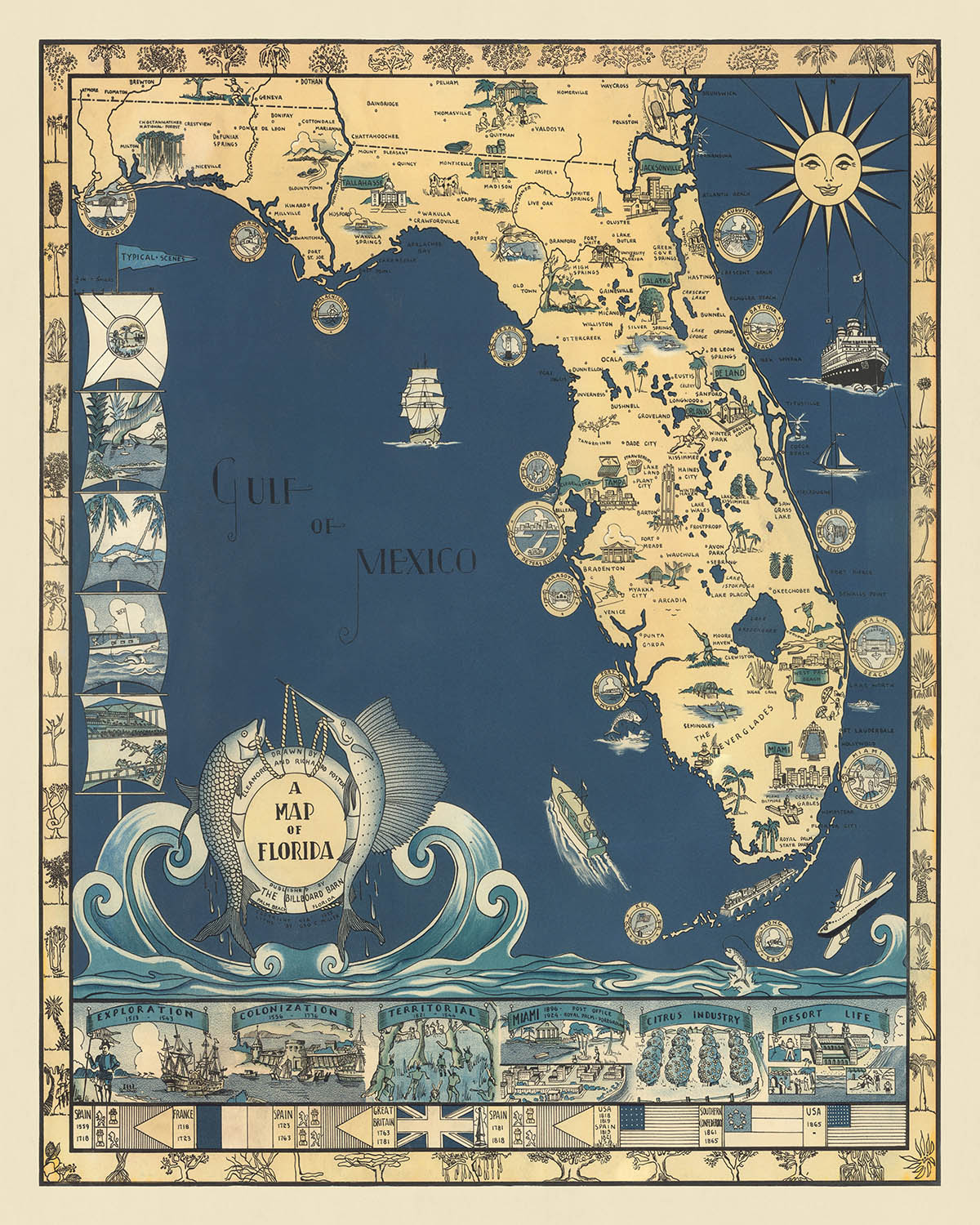 El estilo artístico de Eleanore y Richard Foster es evidente en el detalle meticuloso y la paleta de colores vibrantes de este mapa. El enfoque temático y pictórico que emplearon permite una comprensión más profunda de la historia y la geografía de Florida. Cada ilustración cuenta una historia, desde la vida silvestre nativa que prospera en los variados ecosistemas del estado hasta las actividades humanas que reflejan el desarrollo económico y la diversidad cultural del estado. El talento de los Foster para combinar la estética con la información hace de este mapa una narrativa visual convincente.