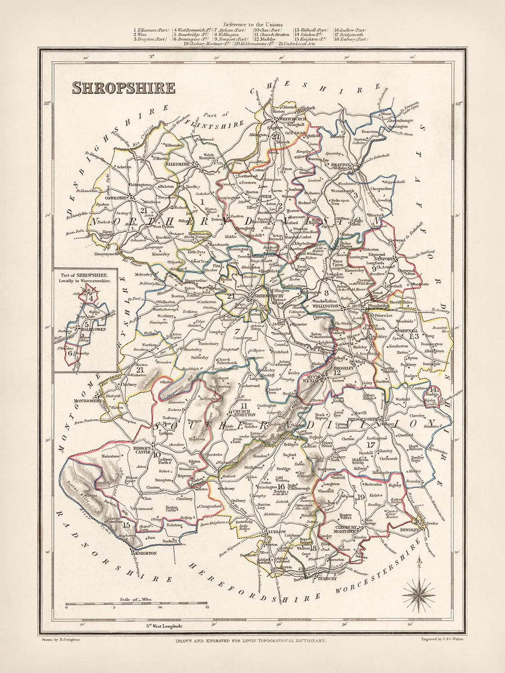 En conclusión, el mapa de Shropshire de Samuel Lewis de 1844 sirve como una ventana a un intrigante paisaje histórico, marcado por asentamientos antiguos, monumentos históricos y un pasado entrelazado con la historia de la Revolución Industrial.