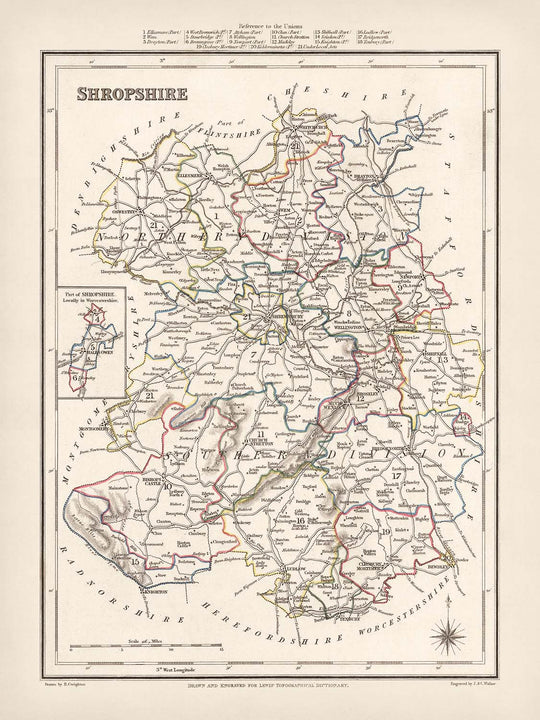 Sumérgete en la grandeza del pasado de Shropshire con este espléndido mapa de 1844 de Samuel Lewis. Celebra la rica historia de uno de los condados más pintorescos de Inglaterra, intrincadamente trazado en un lienzo que captura la esencia de la época. Este mapa cuidadosamente conservado no solo encarna la precisión y el detalle de la cartografía del siglo XIX, sino que también proporciona una fascinante visión del paisaje en evolución de un condado que ha sido el escenario de un tapiz de eventos históricos.