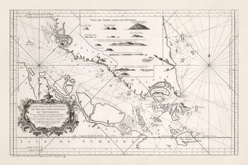 En conclusión, 'Carte Reduite des Detroits de Malaca, Sincapour, et du Gouverneur' es un mapa históricamente informativo que ofrece valiosas perspectivas sobre la historia marítima del sudeste asiático y las prácticas cartográficas del siglo XVIII. Se erige como un testimonio de la habilidad de Jacques Bellin y el atractivo perdurable de las cartas navales. Ya sea visto como un artefacto histórico, una obra de arte o una herramienta de navegación, este mapa es una valiosa adición a cualquier colección.