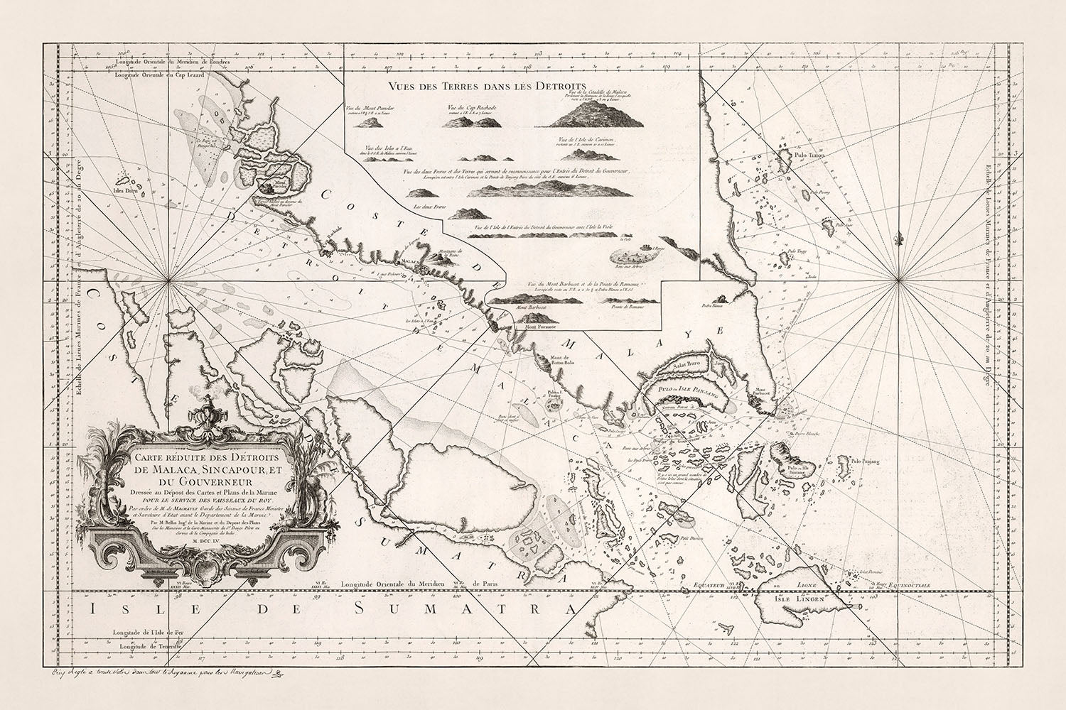 'Carte Reduite des Detroits de Malaca, Sincapour, et du Gouverneur' es un testimonio notable de la maestría cartográfica de Jacques Bellin, un destacado hidrográfico francés del siglo XVIII. Publicada en 1755, esta carta naval retrata vívidamente las intrincadas vías fluviales y formas de tierra del estrecho de Malaca y la isla de Singapur, extendiéndose hasta la isla de Lingga en el sur, Kuala Lumpur en el norte y la isla de Sumatra en el suroeste. La escasa representación de ciudades, una característica distintiva de las cartas navales, subraya el enfoque principal del mapa en la navegación marítima. La excepcional atención al detalle de Bellin es evidente en la precisa delineación de las costas, que fueron las más completas de su tiempo.