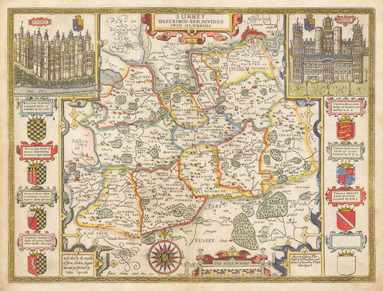 Muchas de las ciudades, pueblos y aldeas en Surrey ya son visibles en este mapa. Curiosamente, hay grabados de dos palacios que ya no existen: el Palacio de Richmond en la parte superior izquierda y el Palacio de Nonsuch en la parte superior derecha. Ambos eran palacios Tudor en los años 1500.
