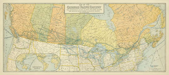 El mapa retrata vívidamente la extensión geográfica de Canadá y el norte de los Estados Unidos, destacando ciudades clave como Toronto, Montreal y Chicago. Traza intrincadamente los caminos a través de bulliciosos centros urbanos y remotas wilderness, ilustrando la importancia estratégica de los ferrocarriles en la conexión de diversas regiones. La representación de los Grandes Lagos y la Bahía de Hudson añade una capa de contexto geográfico, enfatizando las características naturales que influyeron en el desarrollo de estas vitales rutas de transporte.