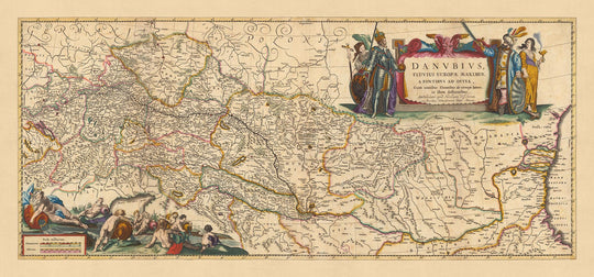 Además de las ciudades, el mapa también incluye varios puntos de referencia y accidentes geográficos. La intrincada red de ríos que desembocan en el Danubio está cuidadosamente trazada, lo que demuestra la interconexión de la región. El mapa ofrece una visión completa de la cuenca del Danubio y proporciona información sobre los fenómenos naturales que dieron forma al desarrollo del continente.