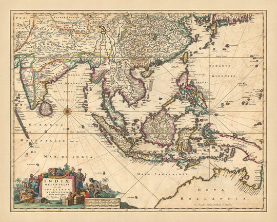 Sumérgete en el rico tapiz de la historia con nuestro exquisito mapa, 'Indiae Orientalis nec non Insularum Adiacentium Nova Descriptio', o en inglés, 'Nueva descripción de las Indias Orientales y las islas adyacentes'. Esta cautivadora pieza fue elaborada por Nicolaes Visscher II en 1690, un renombrado cartógrafo de la Edad de Oro holandesa, que continuó el legado de su abuelo, Claes Janszoon Visscher. Este mapa, con sus meticulosos detalles y su arte, ofrece una visión fascinante del paisaje geopolítico de la mayor zona moderna de Asia a finales del siglo XVII.