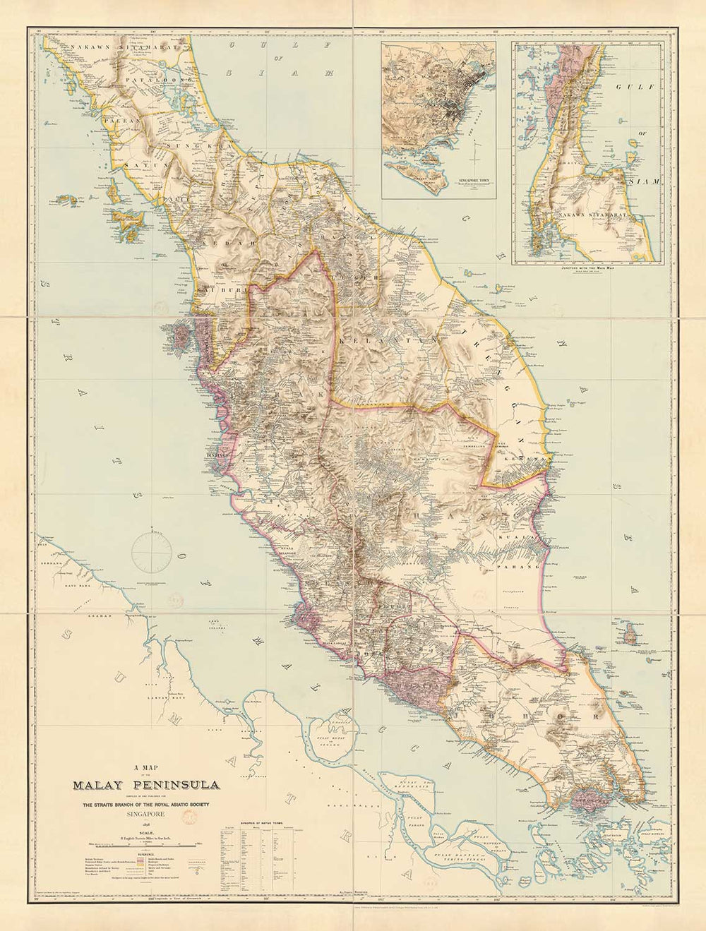 Este maravilloso mapa antiguo de la Península Malaya se publicó originalmente en 1898. Fue creado por John van Cuylenburg y Edward Stanford.
