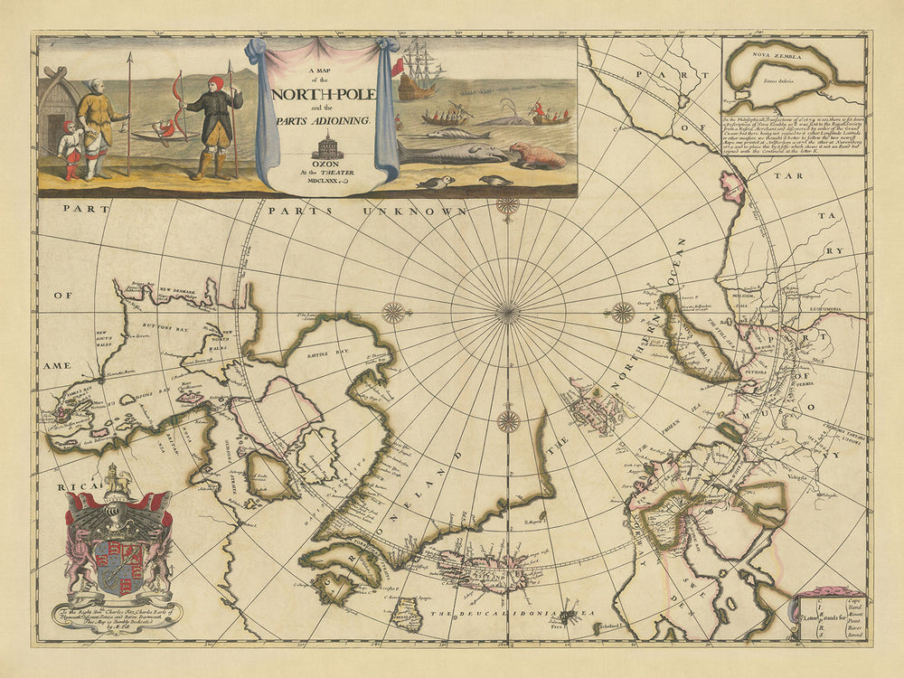 "Un mapa del Polo Norte y las partes Adioining", creado por Moses Pitt en 1680, es un artefacto notable de la cartografía inglesa temprana. Pitt, un cartógrafo visionario, se embarcó en un ambicioso proyecto para ampliar el Atlas Maior de Jansson, una empresa que finalmente lo llevó a la ruina financiera. A pesar del fracaso del proyecto, el mapa del Polo Norte de Pitt se destaca como una nueva producción, distinta de los mapas holandeses reeditados que componían la mayor parte del atlas. Este mapa no sólo representa la habilidad cartográfica de Pitt sino también su determinación de contribuir con trabajos originales al campo de la geografía.