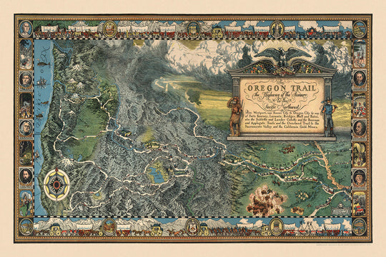 Muestra las diversas rutas que tomaron los colonos, así como los hitos y obstáculos que encontraron en el camino. El mapa también incluye una gran cantidad de información histórica sobre el Oregon Trail, lo que lo convierte en un recurso valioso para cualquier persona interesada en este importante período de la historia estadounidense.