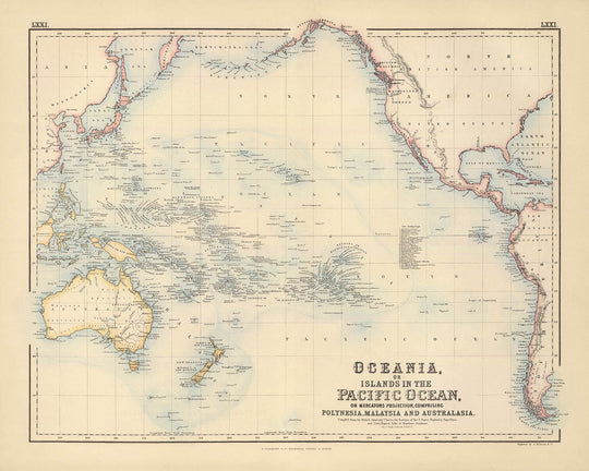 Antigua mapa del Pacífico por Fullarton, 1872: Polinesia, Australia, Nueva Zelanda, Américas