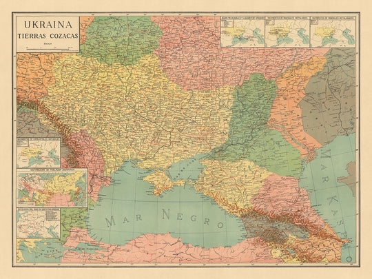 El mapa titulado "Ukraina, Tierras Cossacas," elaborado por B. Mylinsky en 1943, ofrece una fascinante visión de un momento crucial en la historia. Creado durante los tumultuosos años de la Segunda Guerra Mundial, este mapa fue producido por nacionalistas ucranianos que residían en Argentina, un centro para la diáspora ucraniana. Refleja una visión de Ucrania con fronteras ampliadas, capturando territorios que fueron históricamente significativos para la comunidad. Este mapa no solo sirve como una guía geográfica, sino también como un testimonio de las aspiraciones culturales y políticas de los ucranianos durante un tiempo de agitación global.