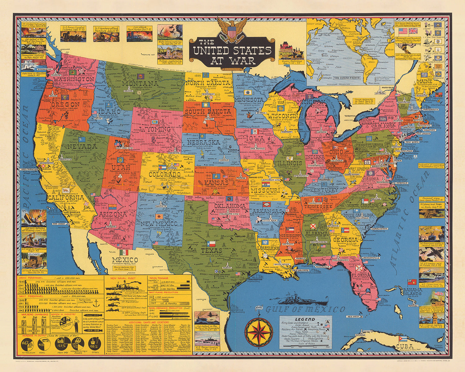 Mapa antiguo de Estados Unidos en guerra por Stanley Turner, 1943: Carta nacional del ejército y la marina de la Segunda Guerra Mundial