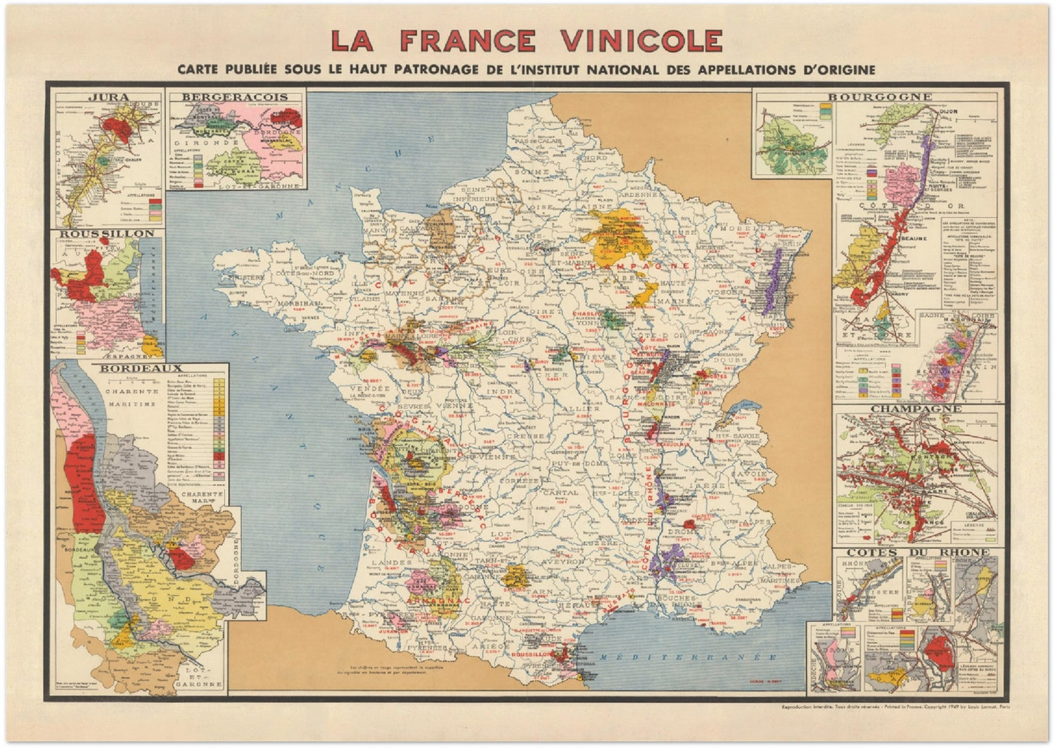 Mapa antiguo de viñedos en Francia "La France Vinicole", 1939: Burdeos, Borgoña, Champaña, Cotes Du Rhone, Bergeracois