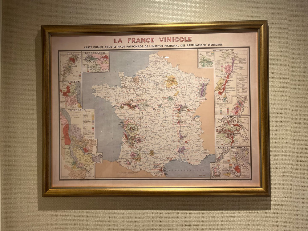 Este colorido mapa en francés, titulado La France Vinicole, que se traduce como Francia Vinícola, muestra las muchas regiones famosas de los viñedos de Francia, incluyendo la Capital Mundial del Vino, Burdeos.